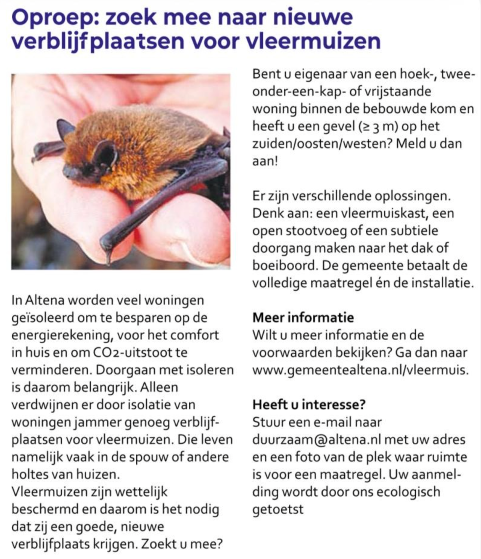 De gemeente Altena vraagt aan de inwoners met een eigen woning om zich aan te melden wanneer ze mee willen helpen om vleermuizen een nieuwe verblijfplaats te geven.